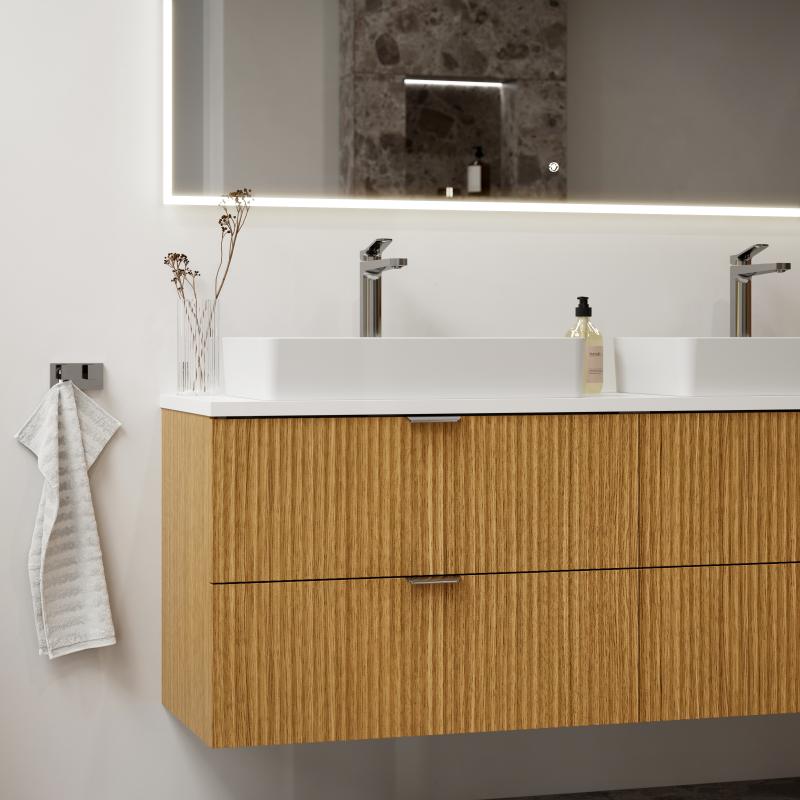MIE Bølge ? et eksklusivt servantskap med bølget overflate i eik finér MIE Bølge er et unikt servantskap skapt for å imponere. Den eksklusive bølget finér-overflaten i eik gir ikke bare et varig inntrykk av kvalitet, men er også et smykke på baderommet. Skap ditt eget baderomsmøbel Velg mellom en klassisk heldekkende servant eller en moderne benkeplate med bolleservant. Personliggjør din opplevelse ytterligere ved å velge mellom blandebatteri og pop-up i krom, sort eller gull. Du kan også legge til LED-belysning i skuffen eller legge en LED list under servanten for å skape den perfekte atmosfæren på ditt baderom. Med fokus på kvalitet MIE-serien er bygd med fokus på kvalitet og er et baderomsmøbel som holder i mange år i et fuktig miljø. Velg blant ulike størrelser, fronter, farger og blandebatteri for å skape ditt helt unike baderomsmiljø. Det er solid utførelse og skuffeskinner med dempingsfunksjon. Monteringen er enkel og smart, sammensatt av komponenter av høyeste kvalitet for en varig løsning. Fornyes enkelt ved å bytte fronter og sidepanel Det smarte systemet til MIE Baderomsmøbel gir deg muligheten til å endre farge eller utførelse på skuffefronter eller sidepanel uten å bytte ut hele møbelet. Ønsker du en forandring over tid, kan du enkelt bestille nye fronter og sidepanel for å fornye utseendet. Tekniske spesifikasjoner: Bredde: 160 cm Dybde: 46cm Høyde: 57cm MIE bølge eik finer Pakken inkluderer MIE skrog, sidepanel og fronter. Pris er uten håndtak, prisen vil variere ettersom hvilket type håndtak du velger. Vennligst merk at servant, pop-up og servantbatteri ikke er inkludert og må bestilles separat.