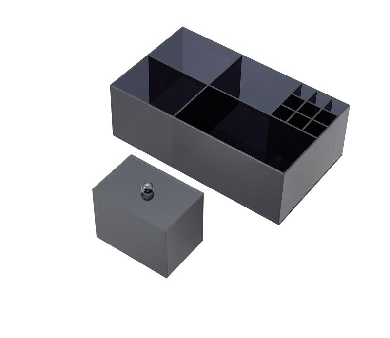 Luxe skuffeinndelinger og oppbevaringer har vi tilpasset slik at de fyller Como-møbelet fullt ut på hver side av utsparingen for vannlås. For skuffeinndelingen til vanlig Como har vi laget en fin og praktisk boks med lokk eksempelvis for Q-tips, bomull, hårstrikker o.l. Boksen er laget for å passe nøyaktig inn i plassen foran vannlåsen, men passer også i venstre hull på skuffeindelingene. Har du Como Kommode, eller vil ha løsningen i underskuffen, kan du kjøpe 2 x skuffeinndelinger + 1 x Extra skuffeinndeling så dekker du hele skuffen. Vi har ogsåskuffeinndelinger for Como SLIM serien. Alle skuffeinndelinger og oppbevaringsløsningerleveres i sort plexiglass. Skuffeinndelingenehar god høyde, så alt står godt.