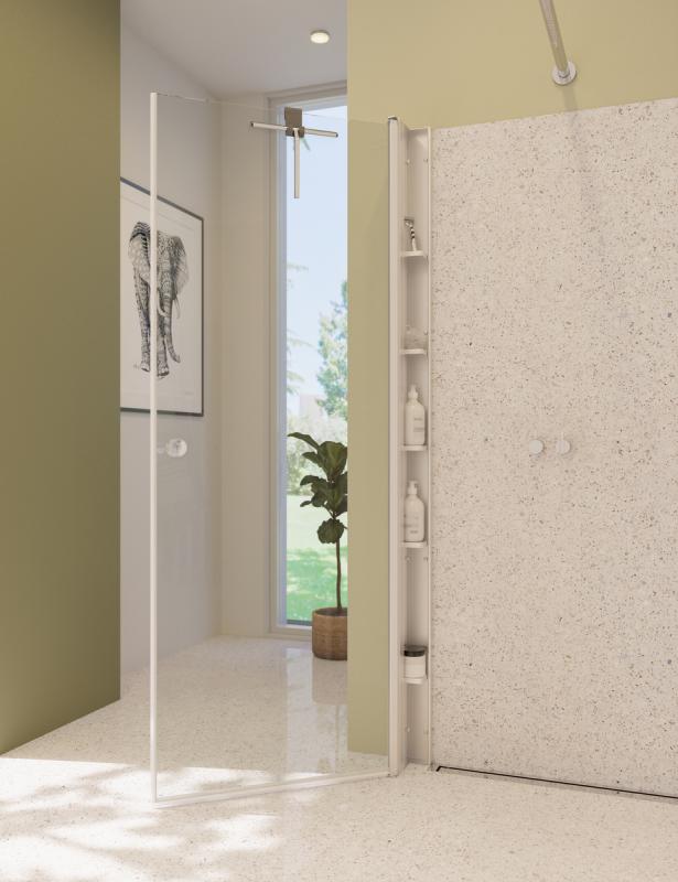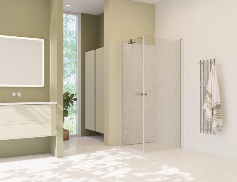 Klassisk og veldig populært dusjhjørne med to dører som kan åpnes både utover og innover når du ikke bruker dusjhjørnet. Det gir god gulvplass på et lite bad og åpner rommet. Elegant og tidløs stil med slanke, firkantede profiler i sateng. Perfekt montering ved skjeve vegger og gulv takket være gode justeringsmuligheter. Høyde på 200 cm gir en effektiv dusjavskjerming, spesielt ved takmontert dusjhode. 6 mm klart sikkerhetsglass med EasyCare for enkel rengjøring og vedlikehold. Her i kombinasjon med Tower oppbevaringsreol til den ene døren, så du unngår rot i dusjområdet.