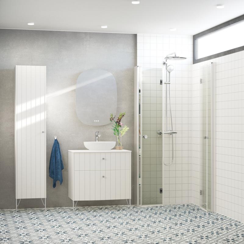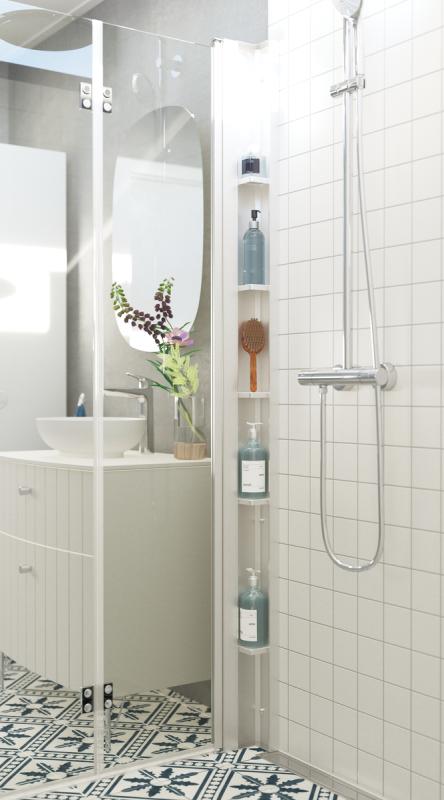 En smart løsning, hvor begge dører kan foldes inn når du ikke benytter dusjhjørnet, så de opptar minst mulig plass i rommet. Det gir god gulvplass på et lite bad og åpner rommet. Elegant og tidløs stil med slanke, firkantede profiler i sateng. Perfekt montering ved skjeve vegger og gulv takket være gode justeringsmuligheter. Høyde på 200 cm gir en effektiv dusjavskjerming, spesielt ved takmontert dusjhode. 6 mm klart sikkerhetsglass med EasyCare for enkel rengjøring og vedlikehold. Her i kombinasjon med Tower oppbevaringsreol til den ene døren, så du unngår rot i dusjområdet.