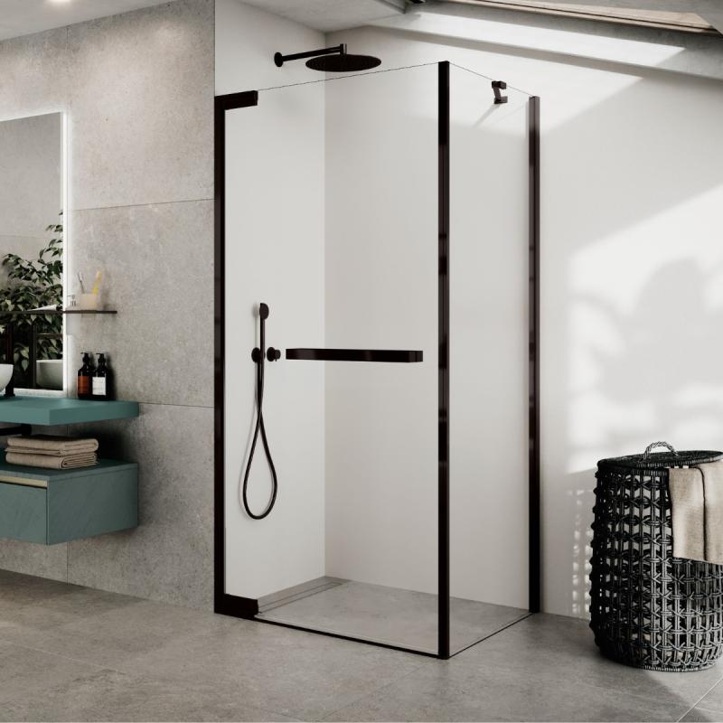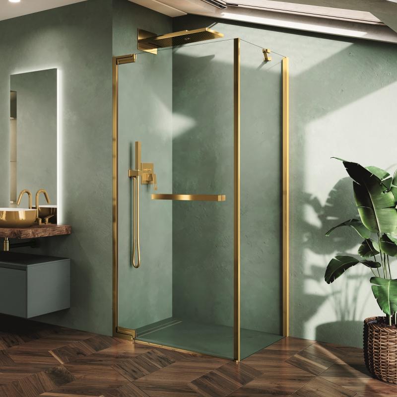 N180 dusjhjørne består av dør og fastvegg. Bredde på dør og fastvegg kan være ulik. Her vist i str 90x90cm i børstet messing overflate. Dør og fastvegg kan monteres både som høyre og venstre løsning. 8mm tykkelse på glasset og behagelig soft-close lukking på døren. Profiler i 5 ulike overflater og bredde 80-100cm. Pris komplett for 90x90 som avbildet i børstet messing og sort matt.
