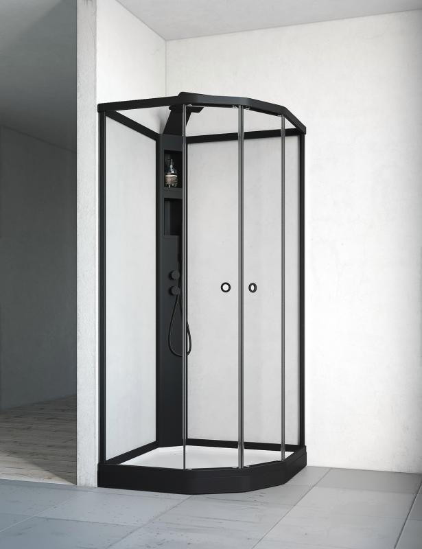 Flow Semi Dusjkabinett innfelt blandebatteri og takdusj Svart Klarglass/Hvita bakvegger 910x910x2180 mm (BxDxH)