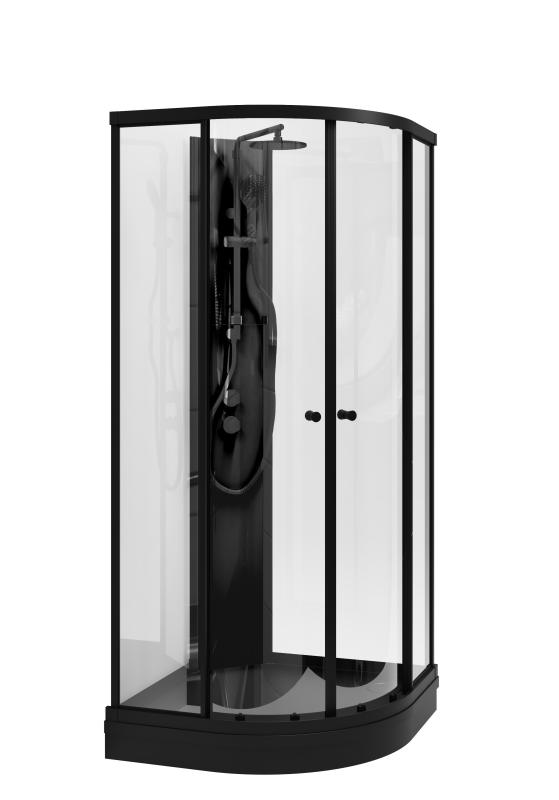 SOFIA Pluss med sorte profiler, sort søyle og klare bakglass Et stilrent og minimalistisk dusjkabinett som er enkelt å rengjøre. Stilrent dusjkabinett med rette, enkle linjer og vippbare dører som gjør det svært enkelt å rengjøre. Dører med doble trinser oppe og nede for jevn og stabil gange ved åpning og lukking. Leveres med integrert termostatbatteri og dusjsett med praktisk hylle. Lavt innsteg Vippbare dører for enklere rengjøring Håndusj med regulerbar hånddusj-holder