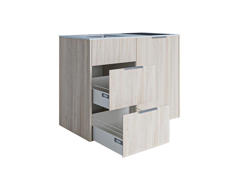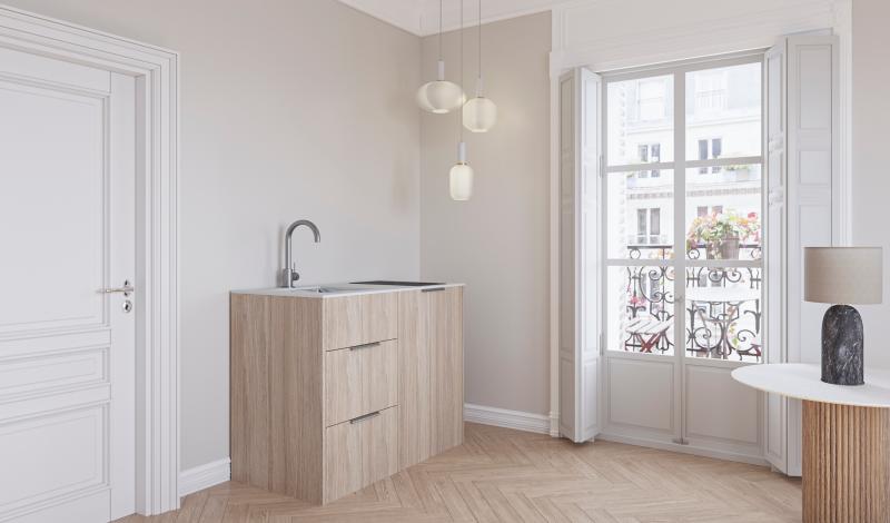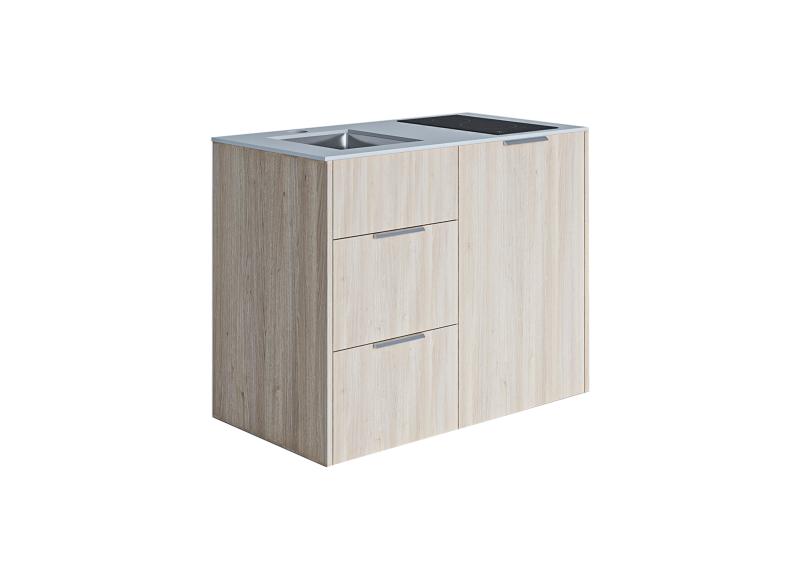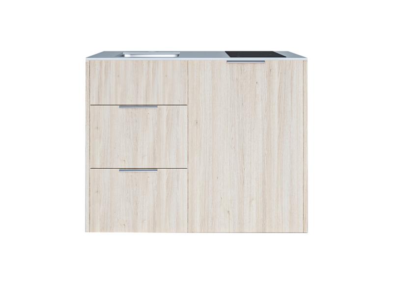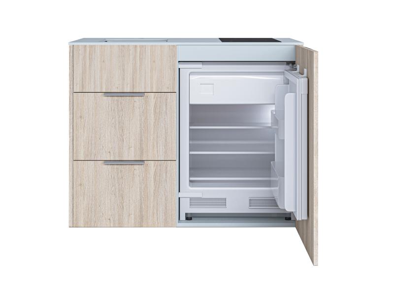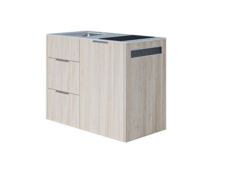 Design minikjøkken, Oslo, Lys Eikefiner, lys grå benkeplate. Inneholder kjøleskap m/frysedel, induksjonstopp 2 soner, underlimt moderne kjøkkenvask, to romslige skuffer med soft-close.